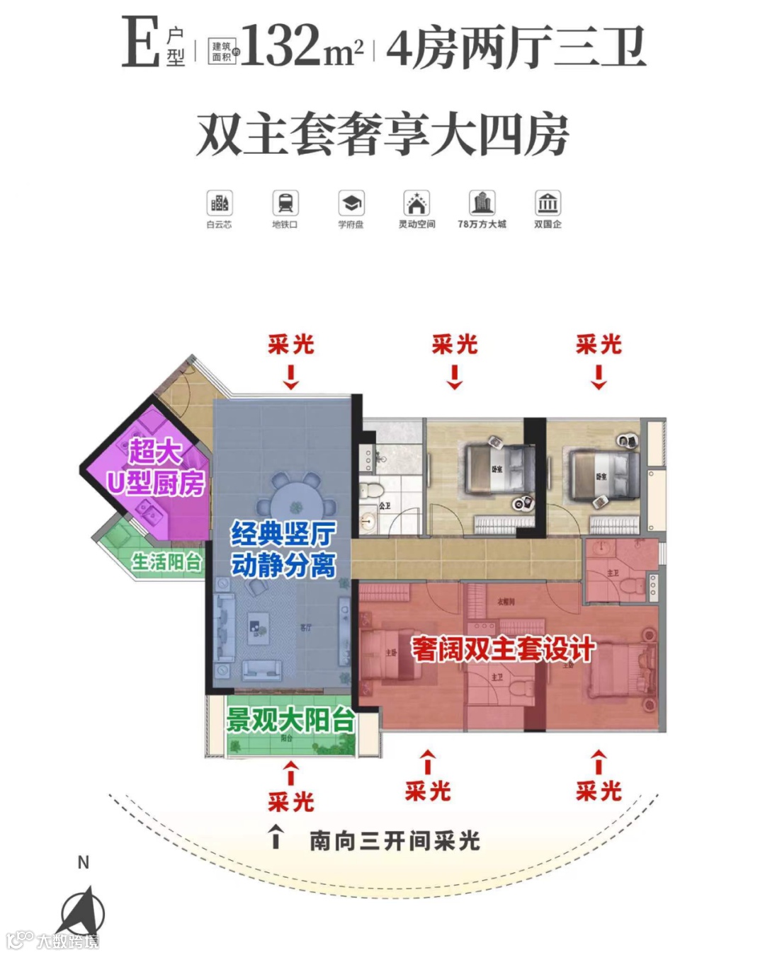 国庆热销的新组团云境,其明星产品建面约132㎡的四房,不仅做到了四房设计,南北对流,引清风阳光穿堂而过,更拥有奢适的双主套配置,是专为高阶改善群体而设的“高定款”。