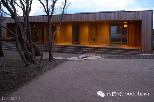 设计师以简练的设计架构,一间低矮的木屋引导出空间的流畅及时尚感。屋前浅浅的几道台阶抬高整体水平线,使之视觉效果极佳,顿时宽广大气感呼之欲出。