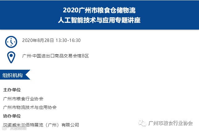 为积极响应国家粮食和物资储备局关于深入推进优质粮食工程的相关要求,帮助粮食企业改造仓储物流设施,实现降本增效、技术升级、高效管理,促进粮食产业经济高速发展,广州市粮食行业协会协同广州市物流技术与应用协会,在8月27-29日汉诺威LET中国广州物流展同期联合举办“广州市粮食仓储物流人工智能技术与应用”专题讲座。