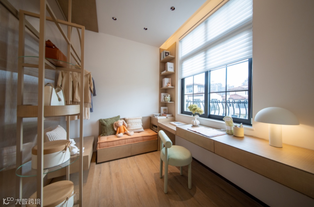 女孩房将浅咖色作为主调,空间舒缓而不甜腻。搭配淡粉、浅绿、橘色,梳理出女孩房的俏皮感。开放式衣柜大方展示女孩的衣橱美学,释放着自由、文艺、典雅的意趣。
