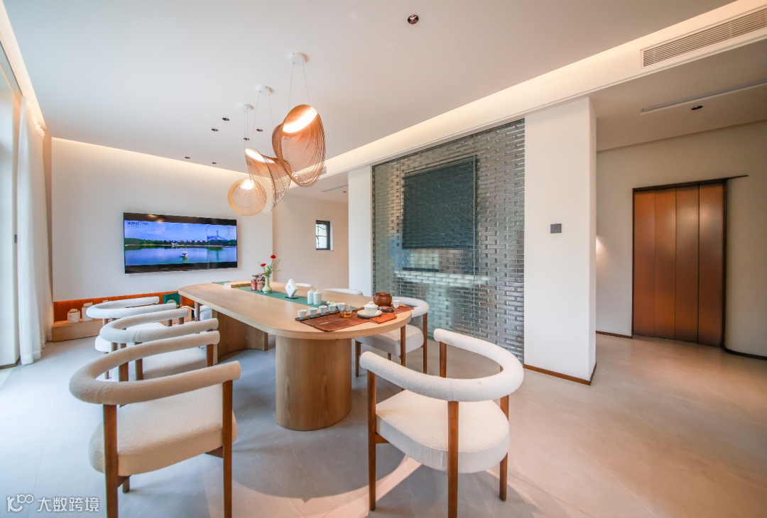 大面积落地窗不着痕迹地将庭院美景尽数收入厅堂。客厅交流空间旁设置书法桌,丰富主人平时的社交活动。日常邀三五知己至家里相聚,一起品尝茶艺、探讨书法,技艺切磋。