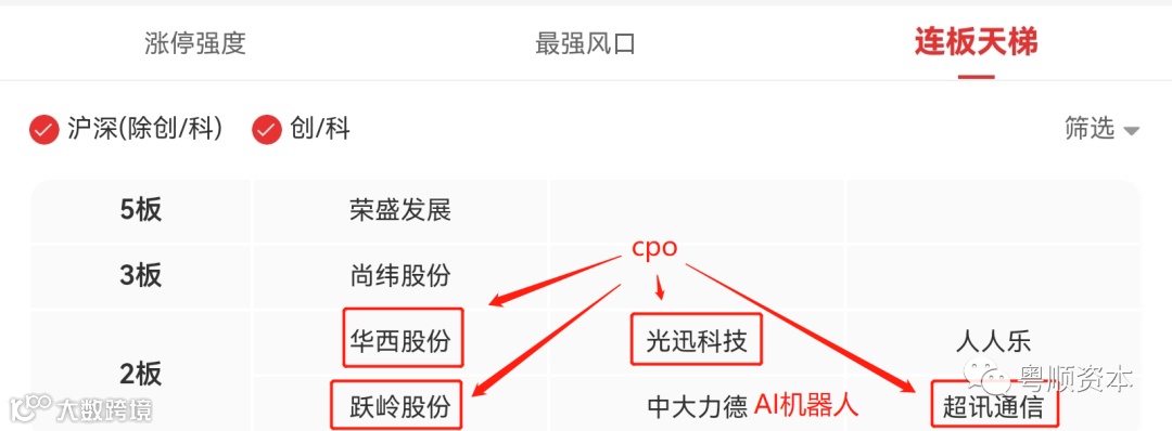 当前短线的连板天梯中,连板梯队并不好看,市场中只有6个二板,其中4个CPO一个AI机器人