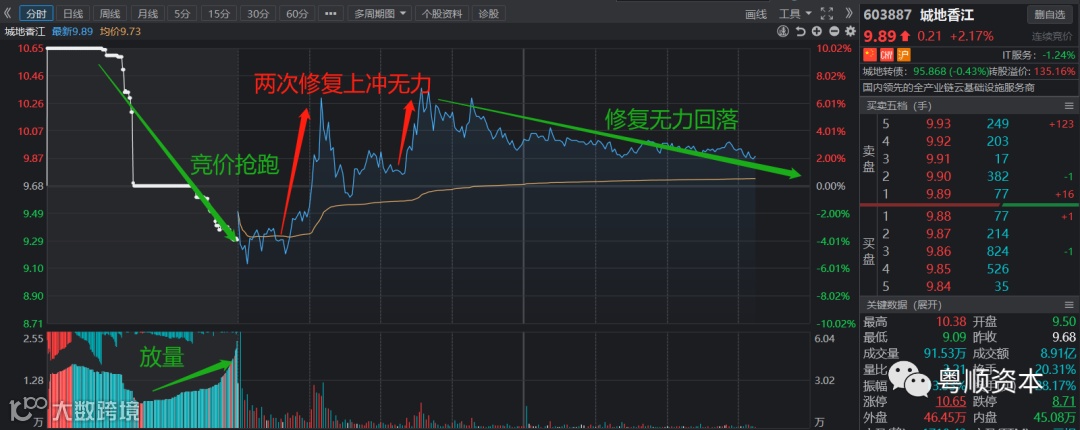 城地香江受昨晚利空消息影响,今天早盘竞价抢跑,低开后持续水下震荡,盘中受CPO超预期走强的影响,两次试图反包上板但失败
