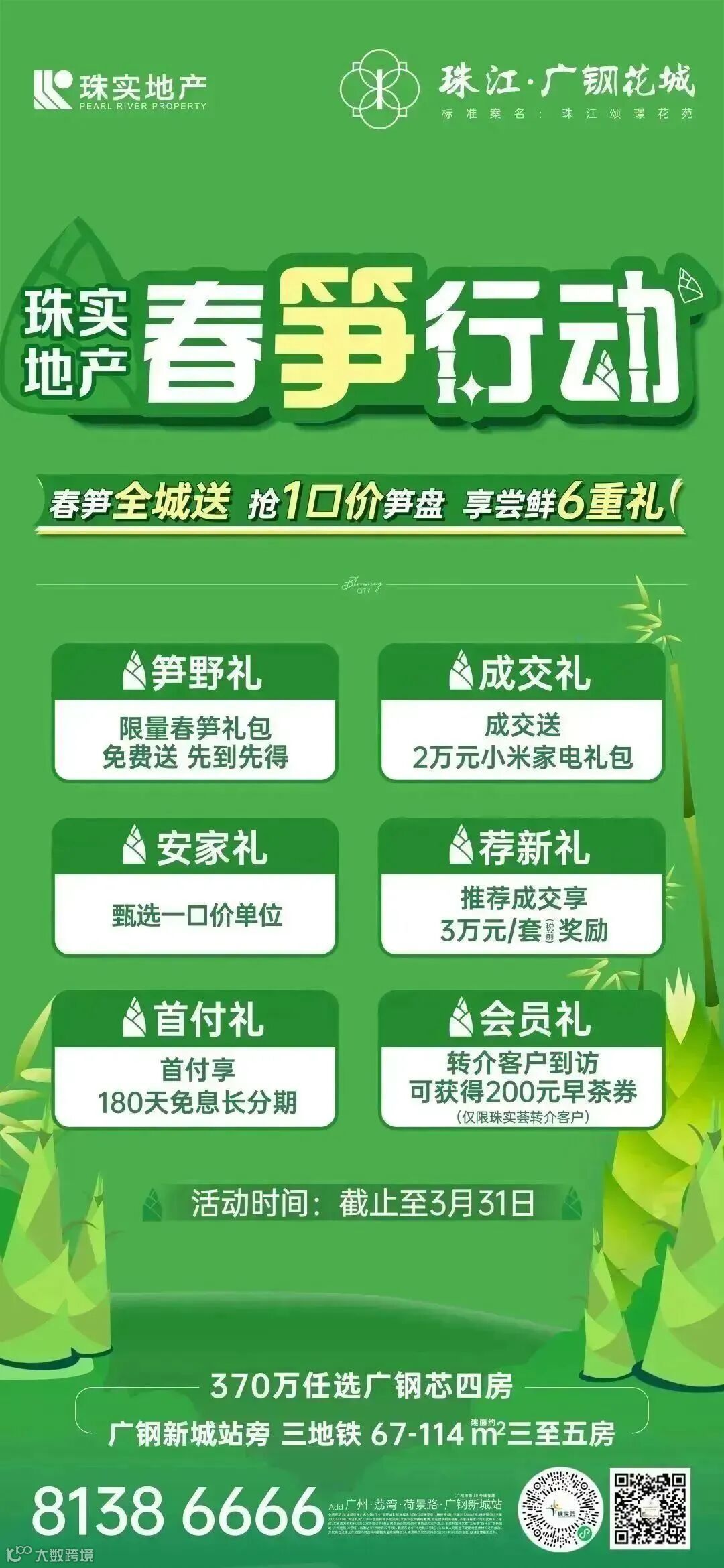 位于荔湾的超级笋盘珠江·广钢花城,更是推出暖春重磅六重礼,以春笋礼包、笋价好房、首付免息长分期、2万元小米家电礼包等多重惊喜回馈新老客户,旨在助力广大购房者买到主城超“笋”的好房子!