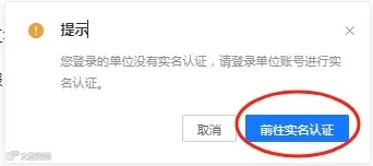在点击“单位办理”后,若检查到单位未完成实名认证,系统会提示单位经办人员需要实名认证。单位授权的个人账号完成实名认证后可继续办理。