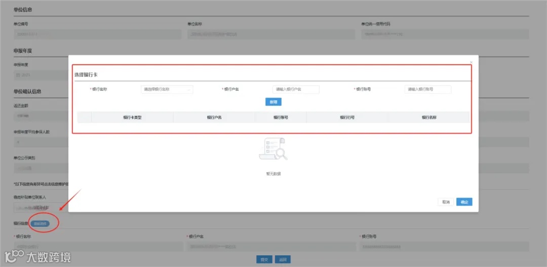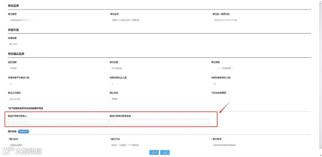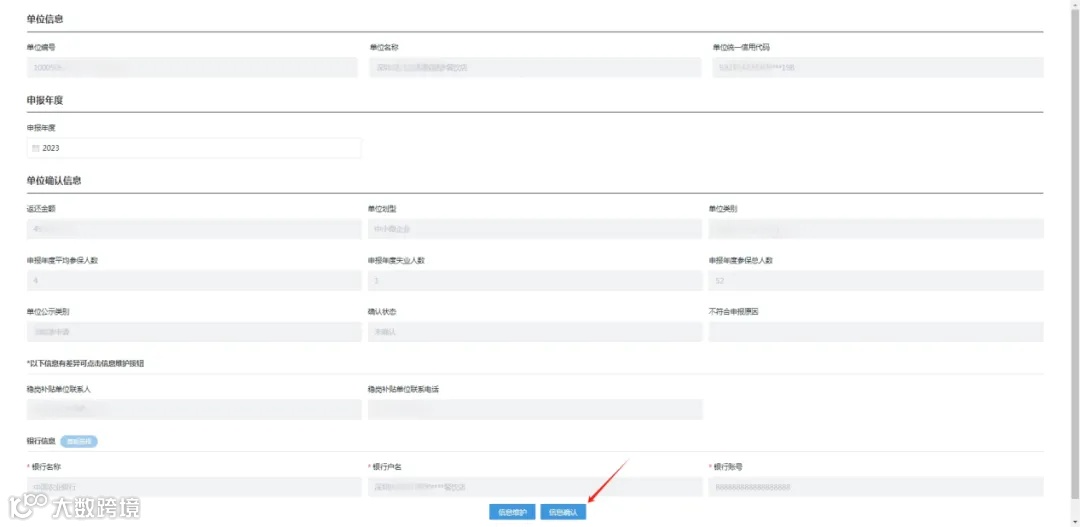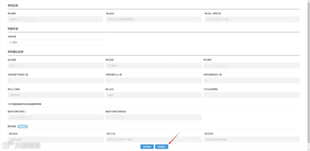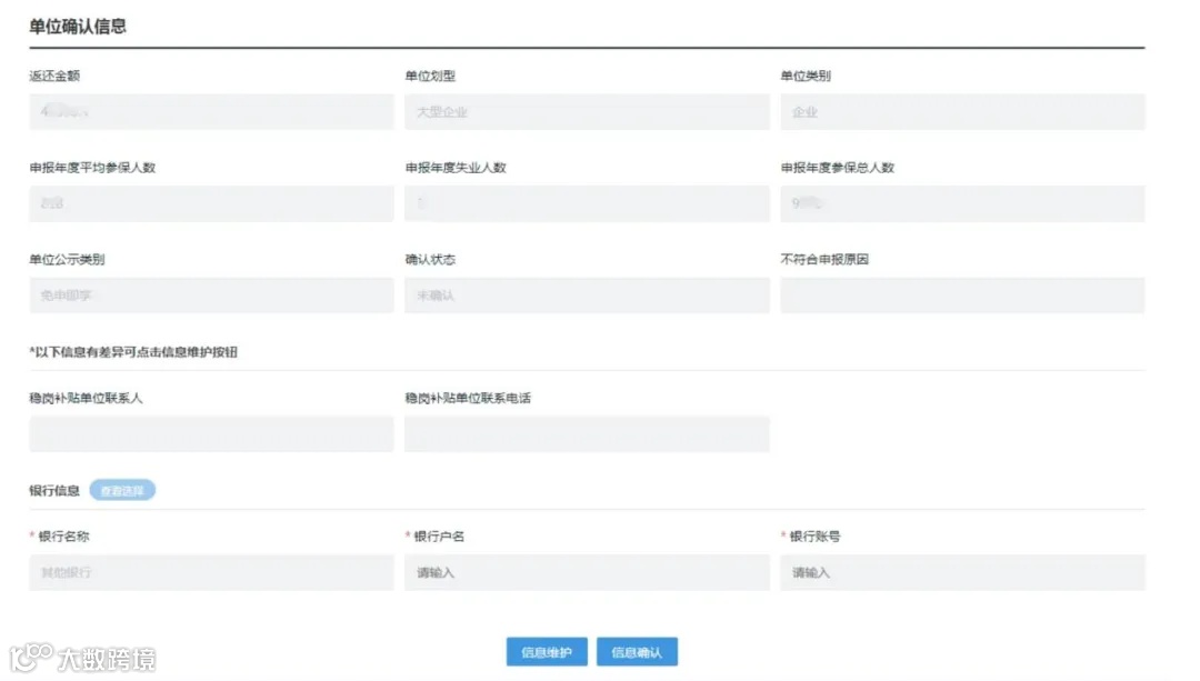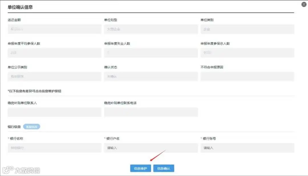 核对和确认本单位划型、人数、返还资金、账户等信息。若单位联系人、联系电话或银行信息有误,可点击“信息维护”进行修改。
