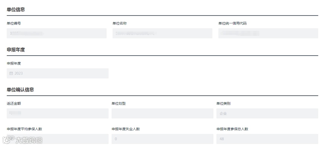 在点击“单位办理”后,选择申报年度为2023年,系统将会展示2023年度稳岗返还详细信息。若系统提示“当前单位没有对应申报年度的稳岗返还信息”,请密切关注相关信息,并在收到确认告知后及时办理。