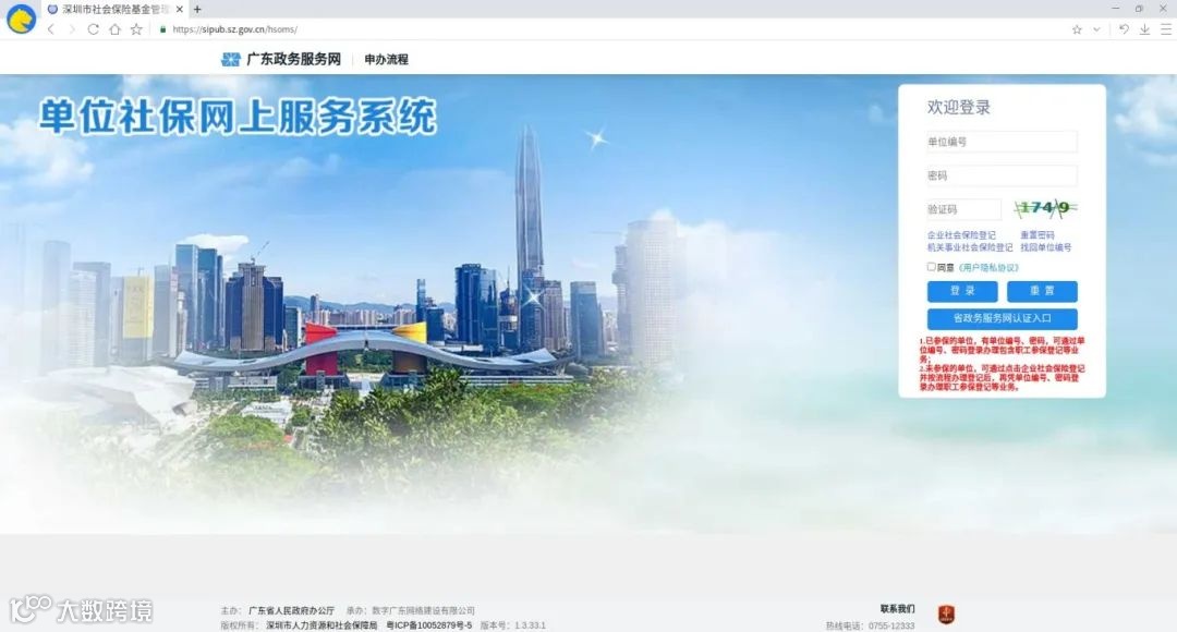 打开深圳市单位社保网上服务系统官网,输入单位编号、密码及验证码,勾选“同意《用户隐私协议》”点击“登录”。