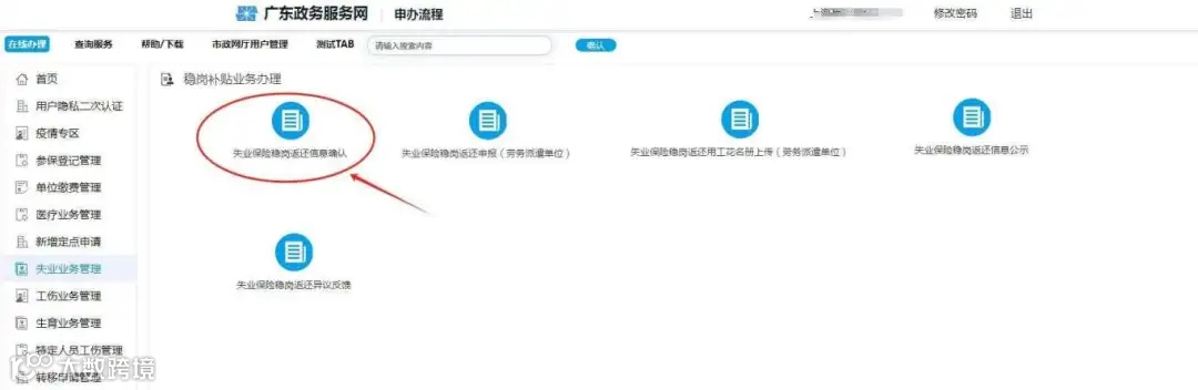 登录后,按“在线服务—社会保障—失业保险”路径,选择“失业保险稳岗返还信息确认”业务并点击“单位办理”。