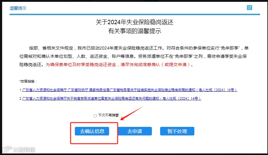 登录后,系统弹窗“关于2024年失业保险稳岗返还有关事项的温馨提示”,可以点击“去确认信息”,自动跳转办理“失业保险稳岗返还信息确认”业务。也可以选择按“在线办理 - 失业业务管理”路径,办理“失业保险稳岗返还信息确认”业务。