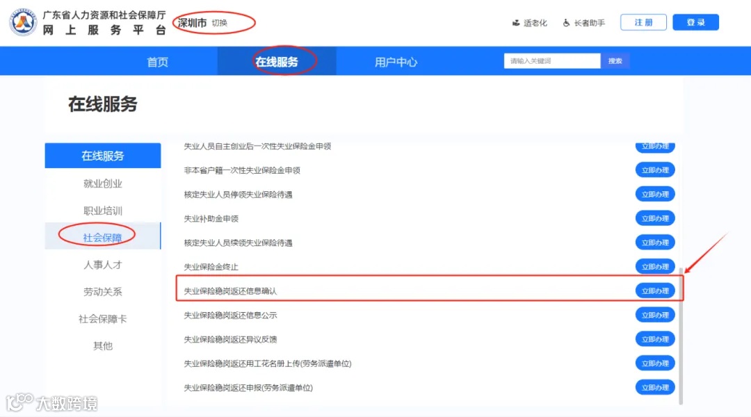 登录广东省人力资源和社会保障厅网上服务(https://ggfw.hrss.gd.gov.cn/),切换地区为“深圳市”,按照“在线服务 - 社会保障 - 失业保险 ”路径,点击“失业保险稳岗返还信息确认”查看并确认申领。详细操作流程如下: