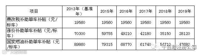 公交企业年度国家油补总额=年度国家燃油补助单车(标车)补贴*公交企业年度平均标车数。单车补助标准见下表:
