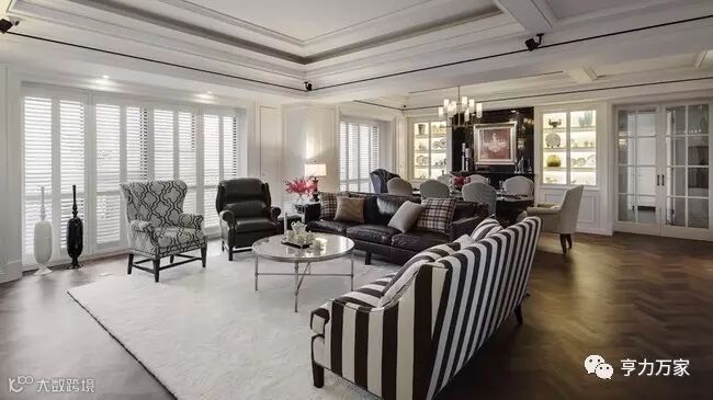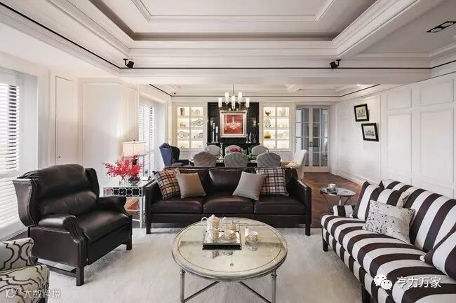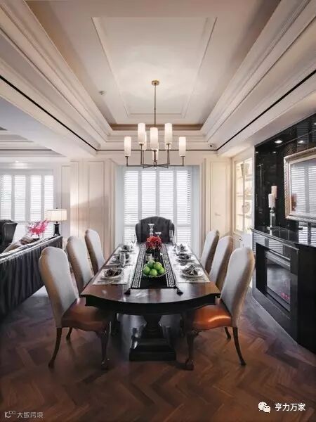 以白为主,光线超棒的大客厅、宴会餐厅采用开放规划,一整面奢侈的连续开窗,统一装设订制白色木百叶,不仅能瞬间美化窗景、维持良好光控,同时也能避免窗帘类的尘螨滋生,是有幼童的家庭最健康的素材选项。