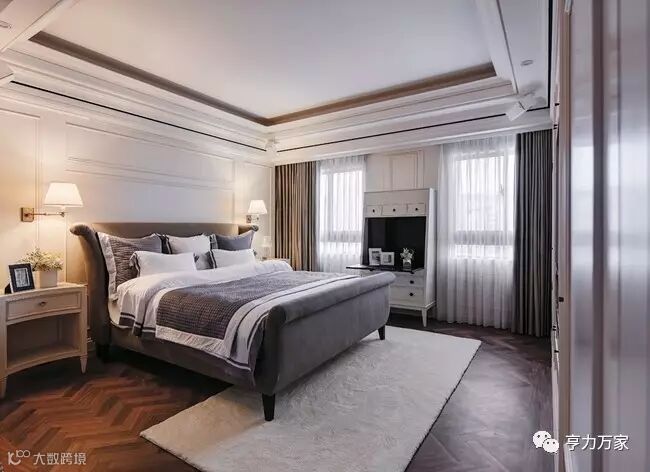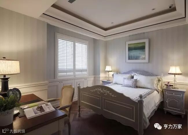 欧式的吊顶让整个主卧空间显得饱满,搭配白灰两色,大气而又突显品位