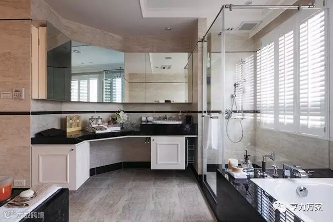 卫生间设计通透,流理台简约大方,百叶窗的装饰让采光有了很好的渠道