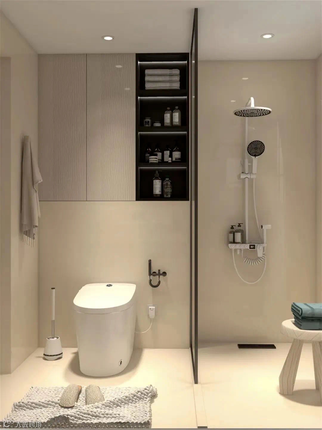 卫生间干湿分离式的设计,沐浴和洗漱分开,高效应用,并且可以保持沐浴之外的场地干燥卫生,通风和干燥效果较好,在回南天里,可以很大程度上降低卫浴间水汽对卧室的影响。