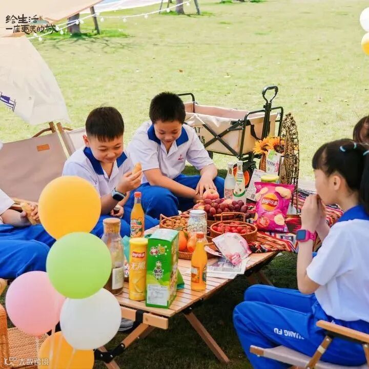 蓝天白云之下,生机盎然的湖岸公园草坪之上,新鲜水果、美味面包零食……