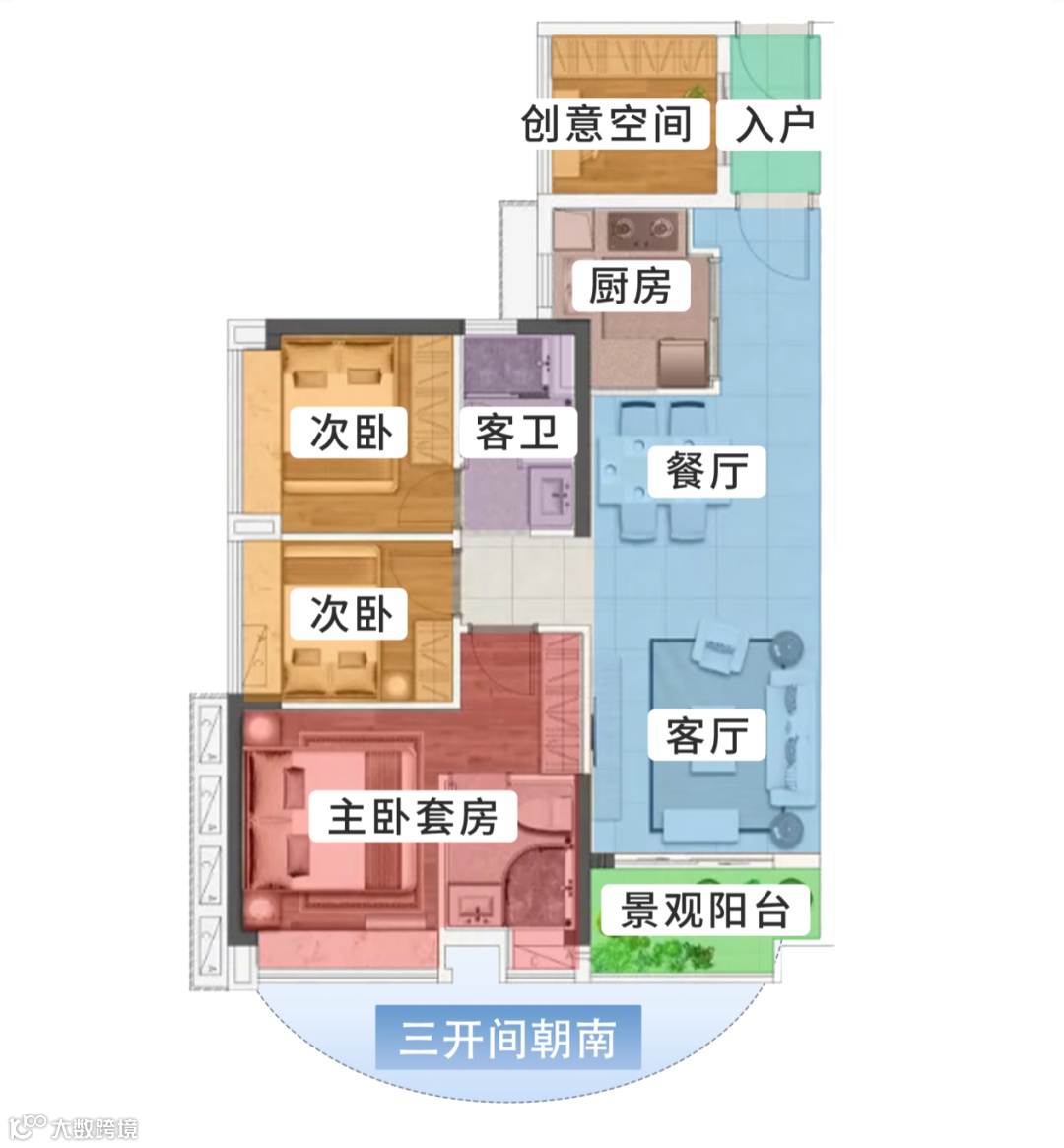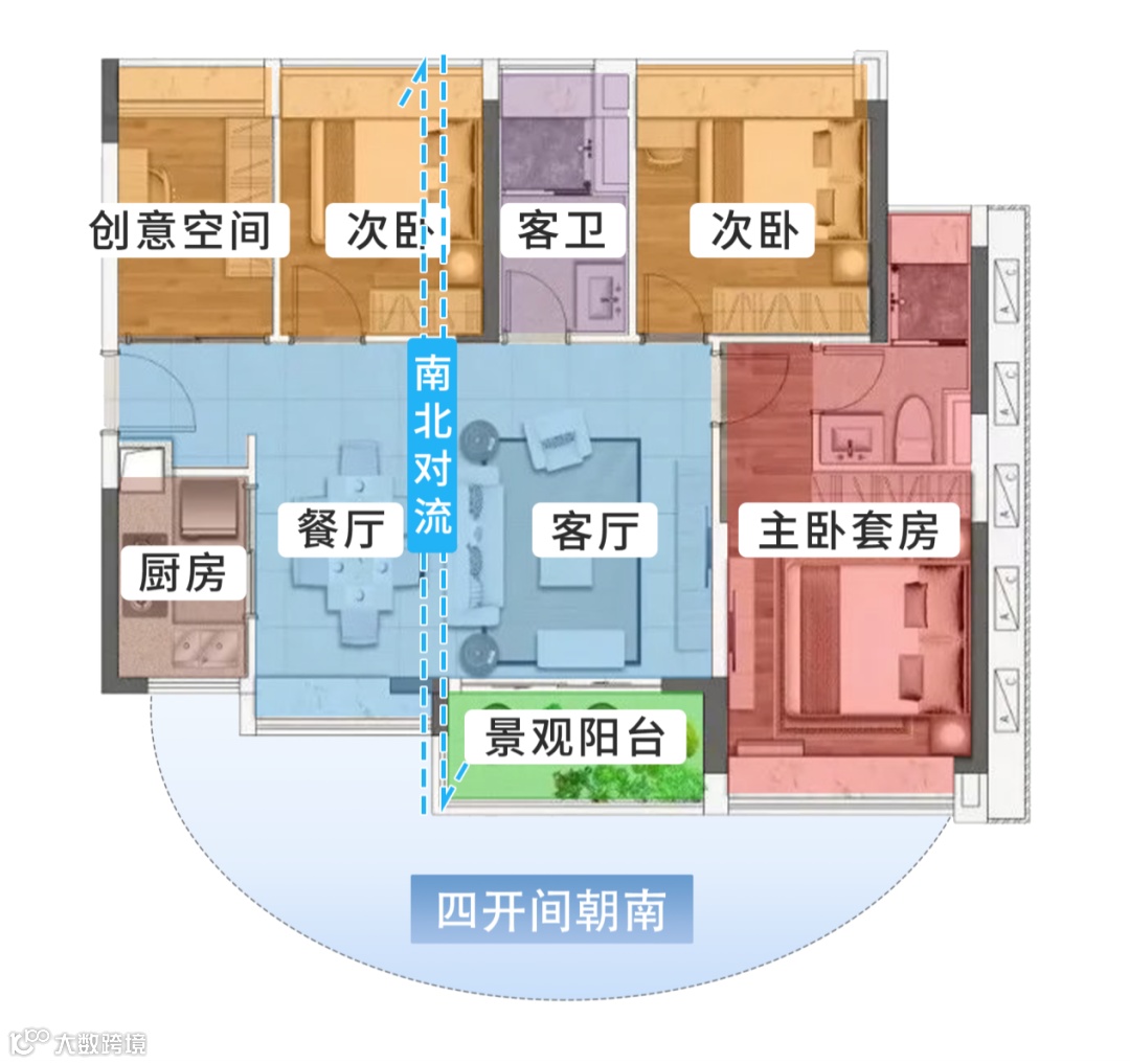5、户型图仅为创意装修示意,仅供参考,不作为要约内容或销售承诺。相同户型单位因楼栋、楼层、单元等差别,局部结构、面积、部分设施设备位置等略有不同。所有单位情况均以政府部门审批及双方签订商品房买卖合同约定为准;