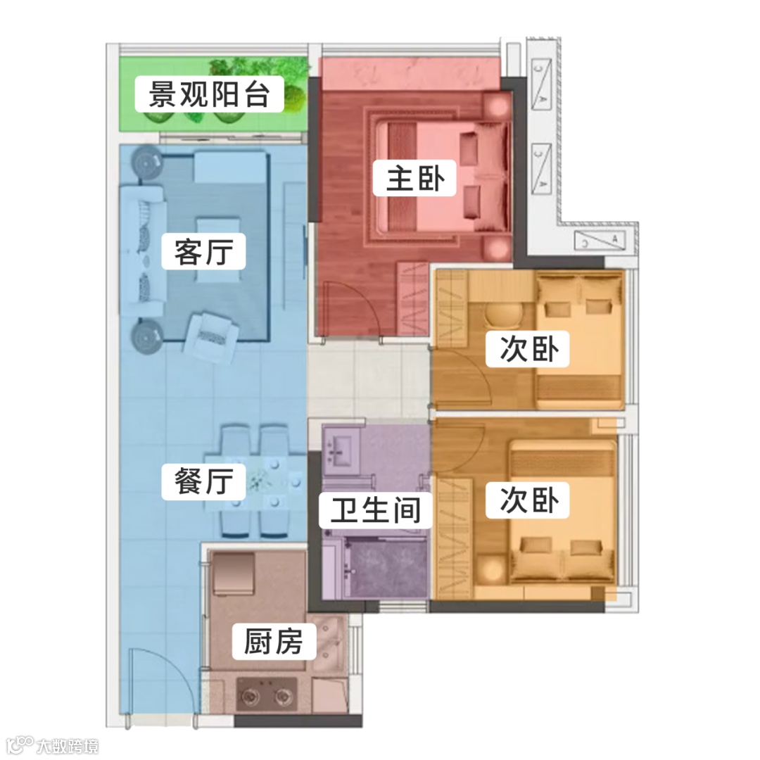 臻稀三房,比市面上楼盘多一房。U型厨房满足日常生活的需求,干湿分离的卫生间提高空间的使用率。主卧方正实用,空间开阔。