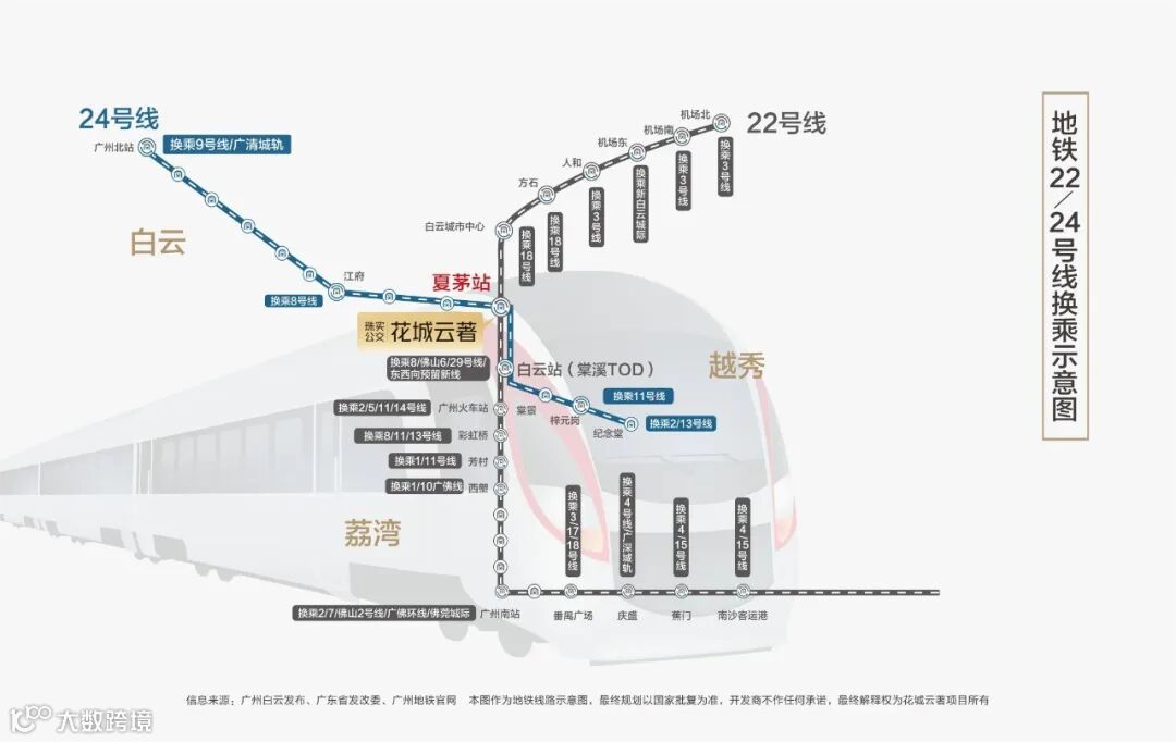 22号北延线(建设中),从夏茅站(建设中)出发,1站白云新城旁,2站越秀,3站荔湾。3站捷达荔湾老城区,半小时直达火车站、机场,做到了荔湾早茶与机场出差的无缝衔接。按照规划,22号线延长线未来将延伸至东莞滨海湾、深圳光明城,将加快广深莞一体化进程。22号线沿线的公交珠实·花城云著直接坐享湾区的全部利好。