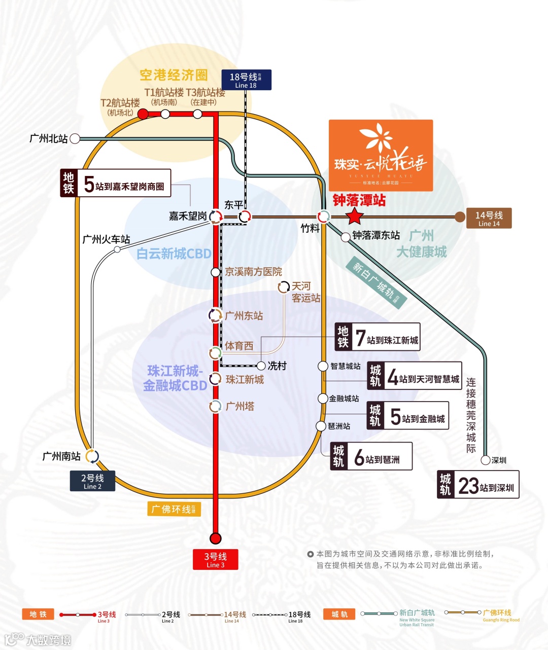 除了地铁外,未来新白广城际(在建)、广佛环线(在建)也将在健康产业园设站,前者与穗莞深串联,1站直达白云机场,通达东莞、深圳,而广佛环线又能让钟落潭4站天河智慧城,5站金融城,6站琶洲。