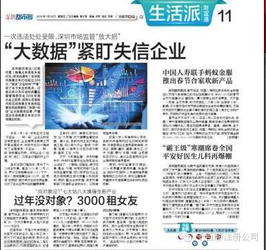 深圳都市报用一个大版面,报道深圳市场监督将放“大招”,针对“失信”企业,深圳实施税收“黑名单”联合惩戒 一处失信处处受限。亲爱的客户大人们请重视公司后期的维护哦,提高依法纳税意识。一旦进入“黑名单”,将“禁止部分高消费行为”不能乘坐飞机、轮船二等以上舱位,不得旅游消费,度假,不得住五星级宾馆。