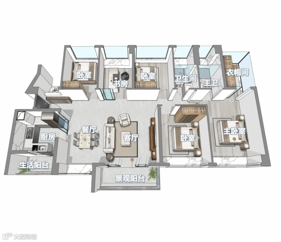 建面约140㎡五房,以合理布局和舒适尺度,赋新生活想象。约16米南向大宽面,采用横厅设计,设计分区动静结合,双向均能直面园林景观。客厅、餐厅、厨房的灵动设计提高空间利用率,增加灵活空间,以实现更多生活场景,赋予家人源源不断的幸福能量。