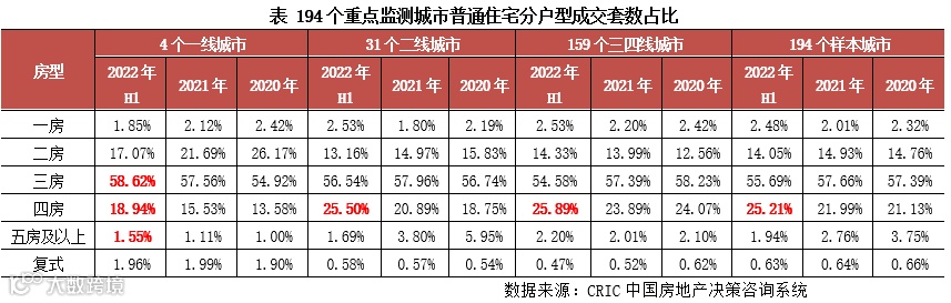 据CRIC数据统计,楼市最重要的现象就是,“多房”户型需求正在爆发。2022年上半年,194个重点监测城市普通住宅成交数据显示,一房和二房成交所占比重依旧很小,而三房成交比重则达到55.69%,四房成交比重升至25.21%。
