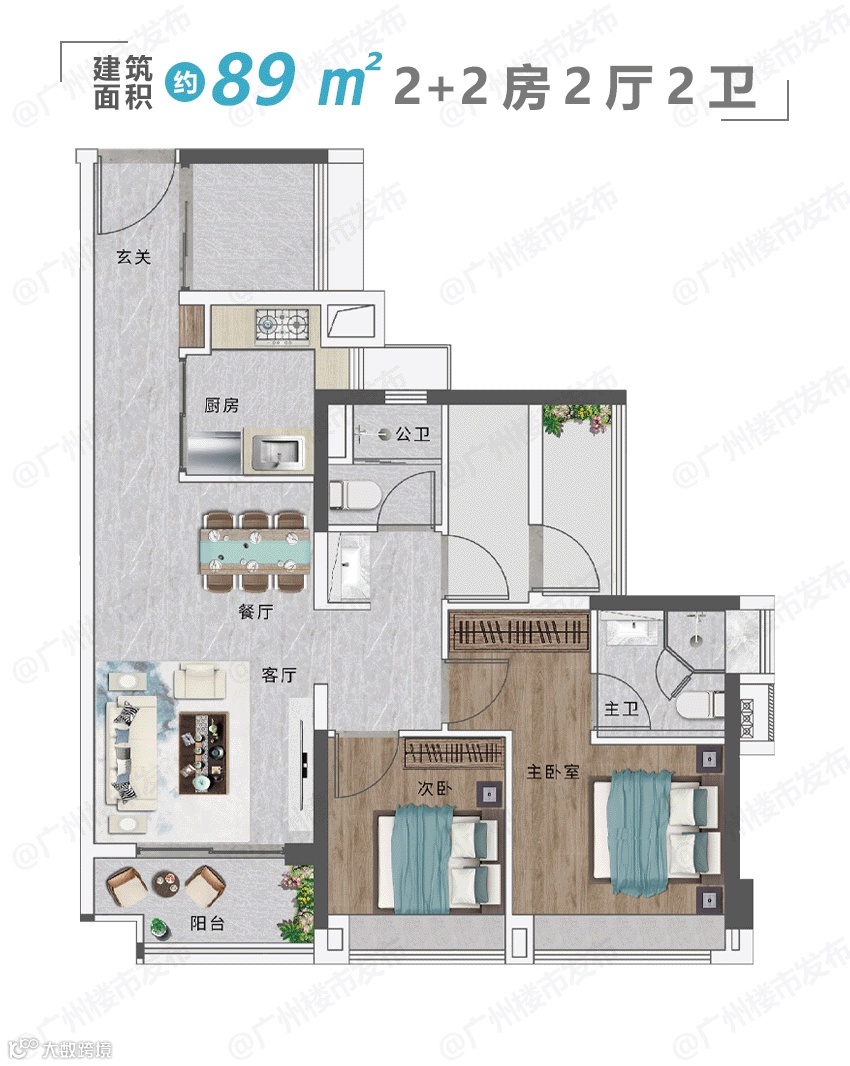 此外,该户型享有全南朝向的独立主套,主人拥享私密空间,而市面上一般只有85平以上才能做到带主套。