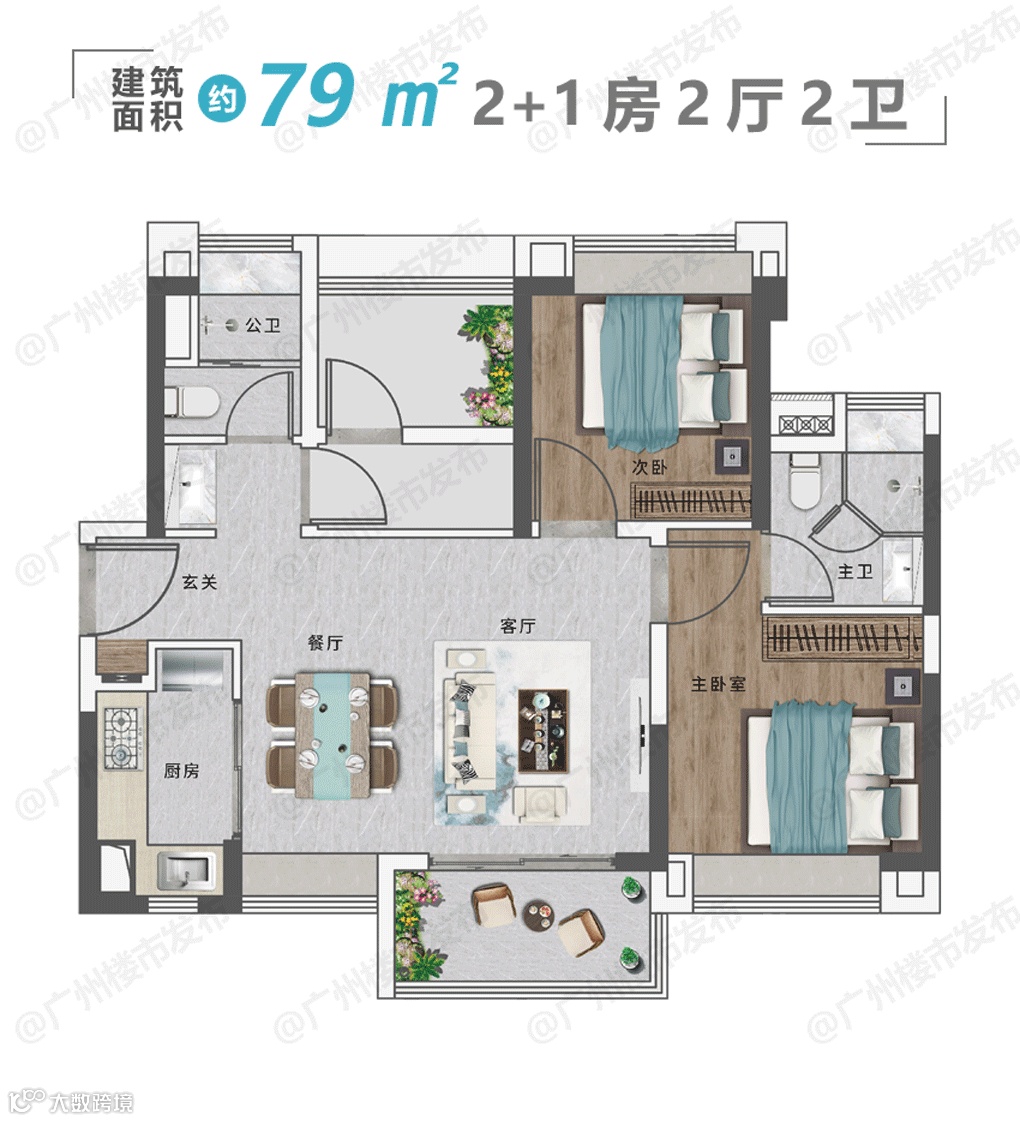 例如建面约79平的3房空间产品,实用率颇高,也是南沙湾住宅在售罕见的小于80平产品,十分稀缺。