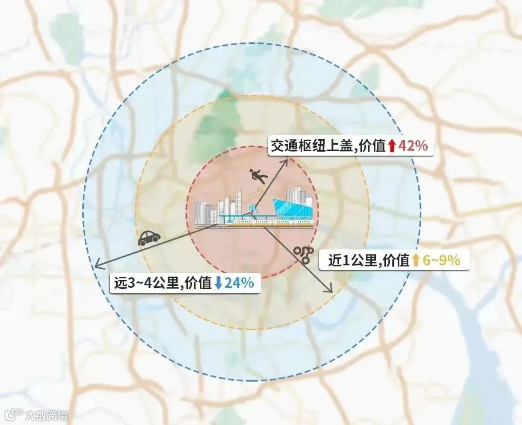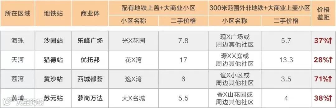参考广州各区同时享有地铁上盖+大型商业配套的住宅项目,对比周边300米范围外的其他住宅二手价格升幅达28-71%。
