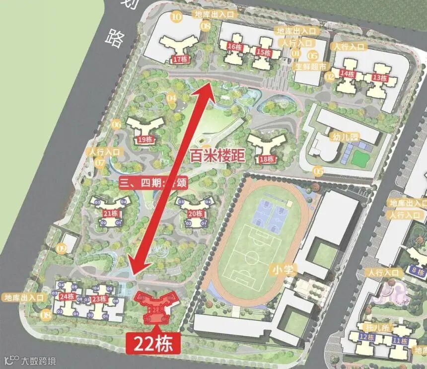 本次加推22栋,处于小区最南侧,可享南向开阔视野,为独栋设计,最大楼间距约100米,北侧园林景观尽收眼底。