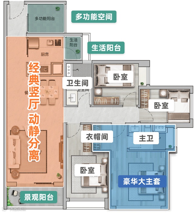 整个户型三开间朝南,双阳台,采光和通透性好,主卧带有衣帽间和独立卫浴,私密性和品质感都能兼顾。