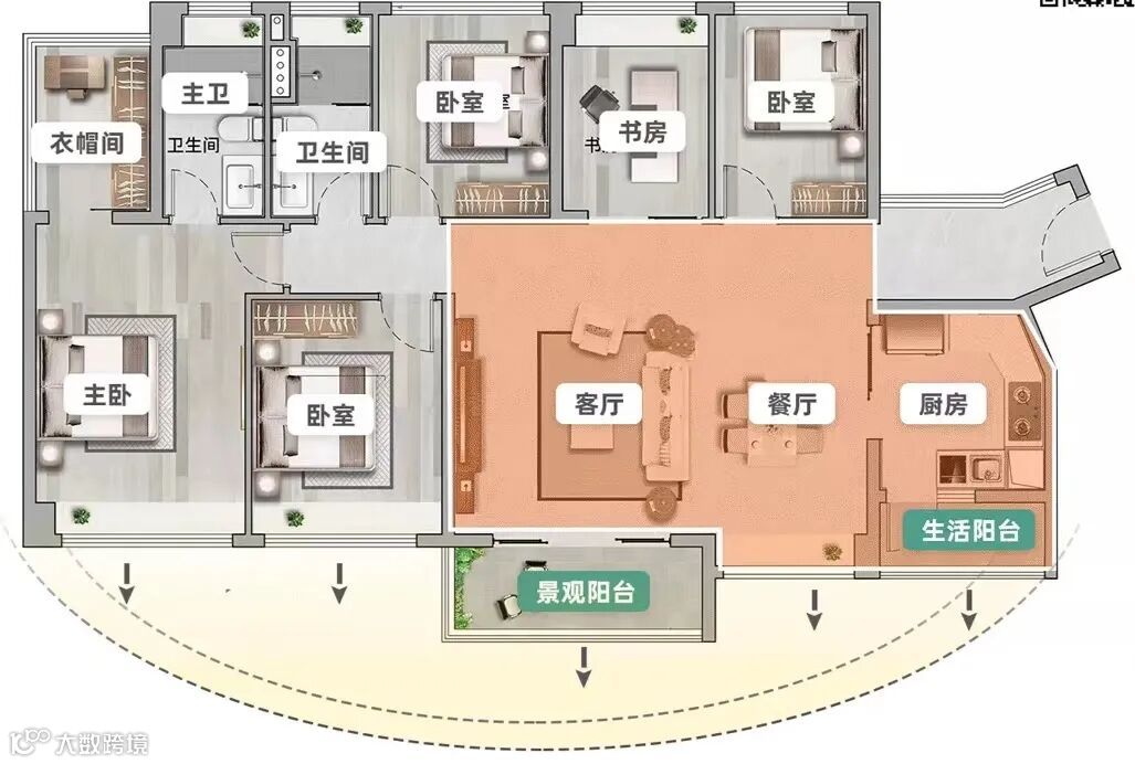 建面约117平4+1房户型,约90%的空间利用率相较市面上普遍不到85%的水平,性价比更高。