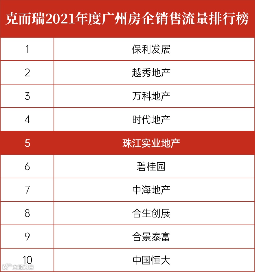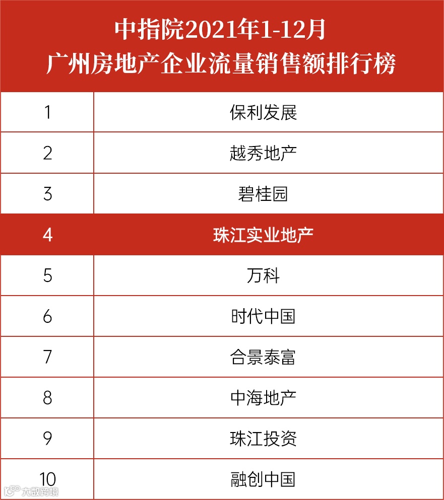 近日,易居企业集团旗下克而瑞研究发布了2021年度广州房企销售流量排行榜,而由中国房地产指数系统、中指院发布的2021年度广州房企销售流量排行榜亦公布了排名,珠江实业地产凭2021全年优异销售流量、销售额等跻身“克而瑞2021年度广州房企销售流量排行榜前五”及“中指院2021年1-12月广州房地产企业流量销售额排行榜前四”,跃进一阶、实力担当。