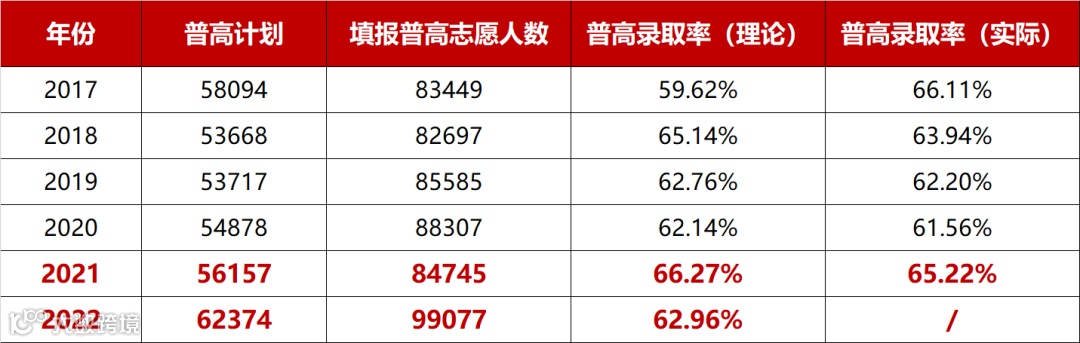 去年广州中考的普高实际录取率是65.22%,今年虽然填报志愿人数增加,但随之普高招生计划也有所增加,增加到62374个,比去年的56157个增加了6217个。而今年填报普高志愿的考生是99077人,那么理论上,今年普高的录取率是62.96%,同比下降2.26%,中考竞争愈趋激烈。