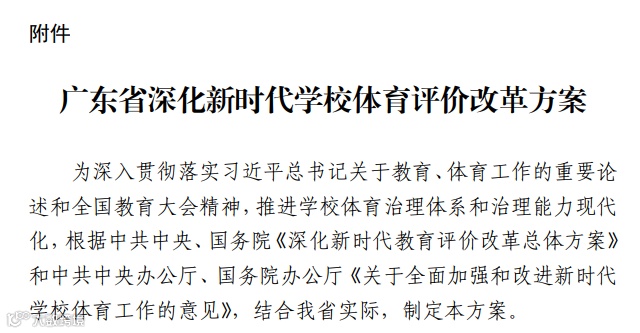 “双减”政策的落地,不仅减轻了学生的作业和校外培训负担,也对中小学的体育教学产生了影响。3月9日,广东省教育厅发布《广东省深化新时代学校体育评价改革方案(征求意见稿)》(下称《方案》),《方案》提出推进体育中考改革自2022年入学新生开始采用“素质评价(占比30%)+统一考试(占比70%)”体育中考模式,体育中考成绩占中考录取总分12%的权重计入录取成绩。