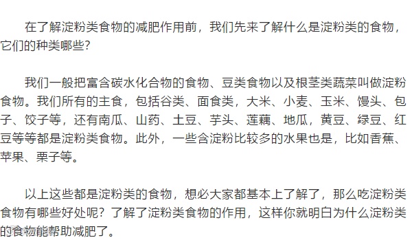 看到上面列举的食物就知道,淀粉类的食物基本上都是饱腹的食物,一日三餐随便吃一点就饱了肚子,这是因为淀粉类的食物富含能量,能延长饱腹感,避免一到半下午或者半夜就因为饥饿而吃其他的高热量零食。
