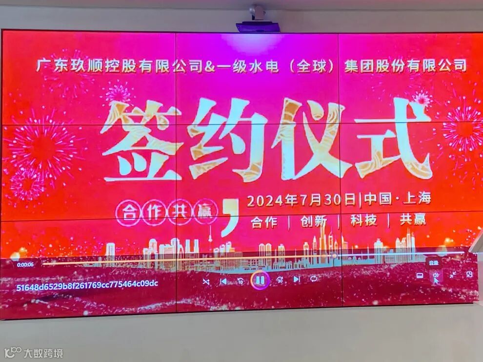 2024年7月31日,广东玖顺控股有限公司与一级水电(全球)股份有限公司签约仪式在上海虹桥世界中心顺利举行,合计超200亿元的全面战略合作达成,开启更高水平、更深层次、更宽领域的合作新章。