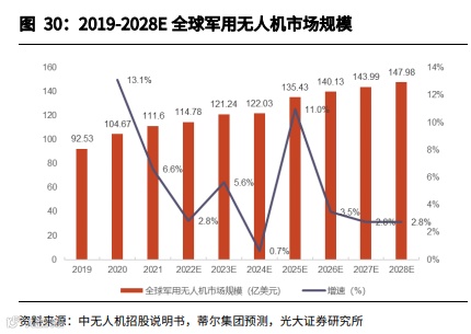 国防预算稳健高增速夯实军队“购买力”,无人机需求有望见拐点、增长空间广阔。