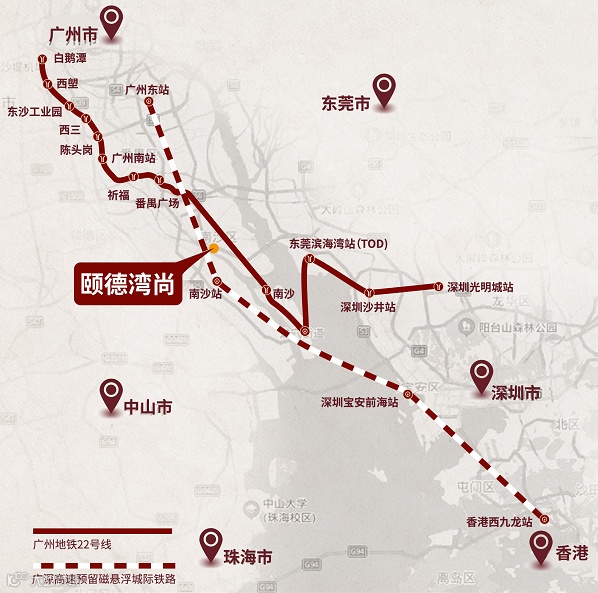 广州地铁22号线延长线可实现广深“牵手”,未来将以南沙为中间节点,一头连接广州中心城区,另一头联通东莞、延伸到深圳,南沙湾区几何中心区位价值尽显。