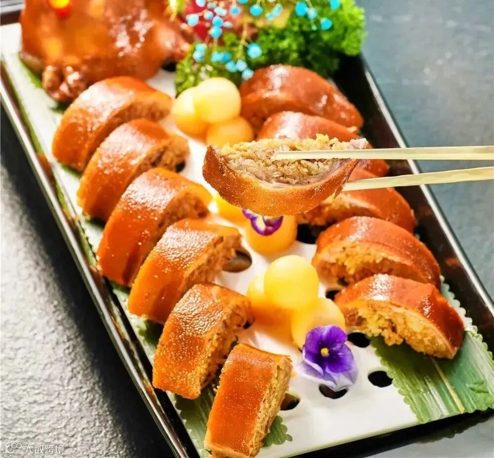 酿制好的“有米猪”,师傅会用平烤的方式,全程把控让乳猪均匀受热。烤制后的汝猪肉酥皮香,软糯甘香的糯米饭充分吸收猪肉的肉汁。