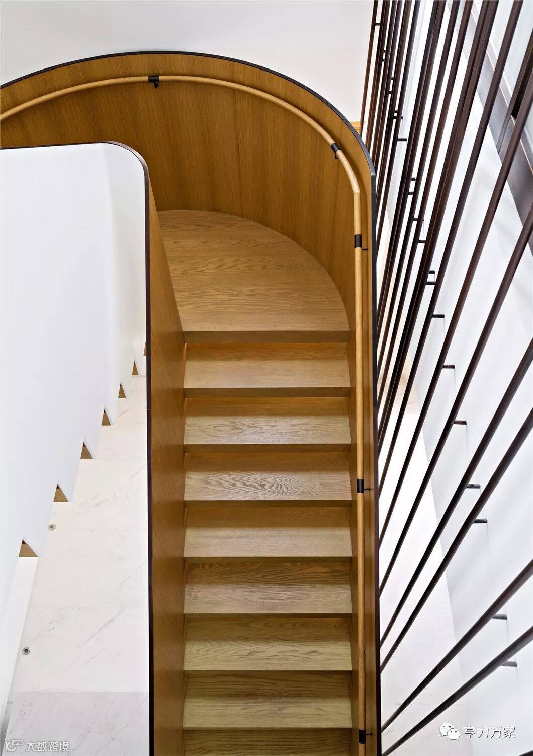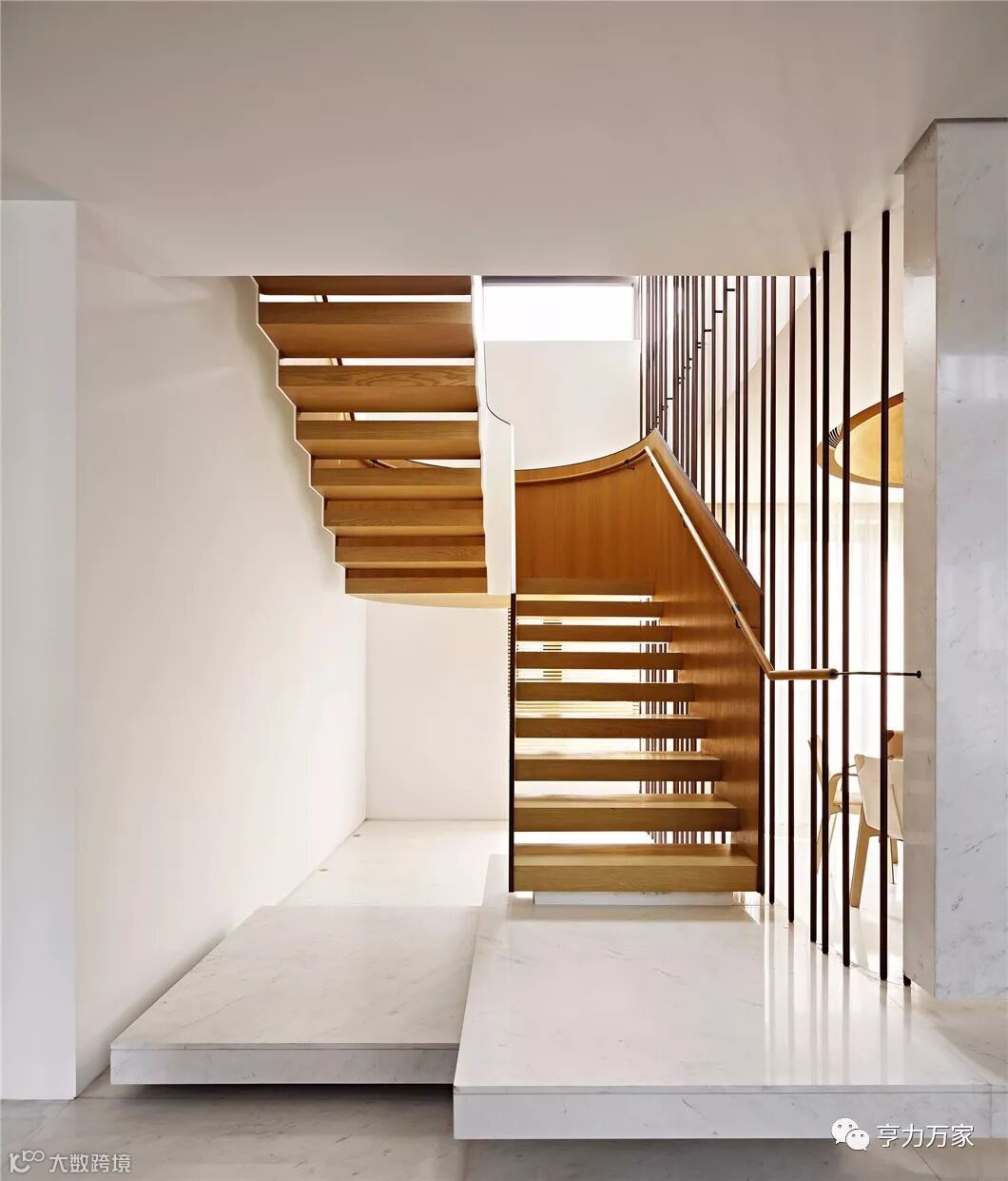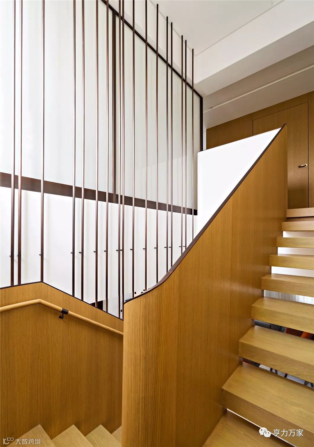 楼梯间在空间中是特殊的存在,作为垂直交通的功能组件,它直接联立其楼层的转换,打开楼板插入在空间中,突破循规蹈矩的秩序。交通的专属特性,赋予它流动性,与空间的安静形成对比。