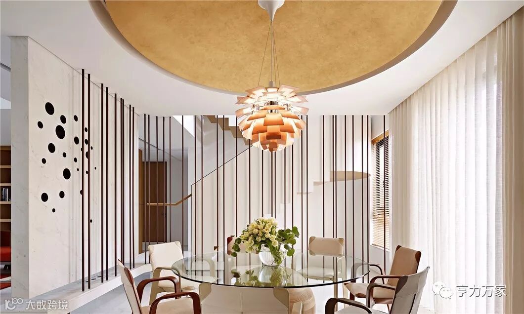 圆形吊顶覆盖金箔,空调出风口嵌入吊顶外圈凹槽,调节温度的同时注重了美观。灯光点亮整个空间,微妙的光线,透出对大自然的理解和转化。