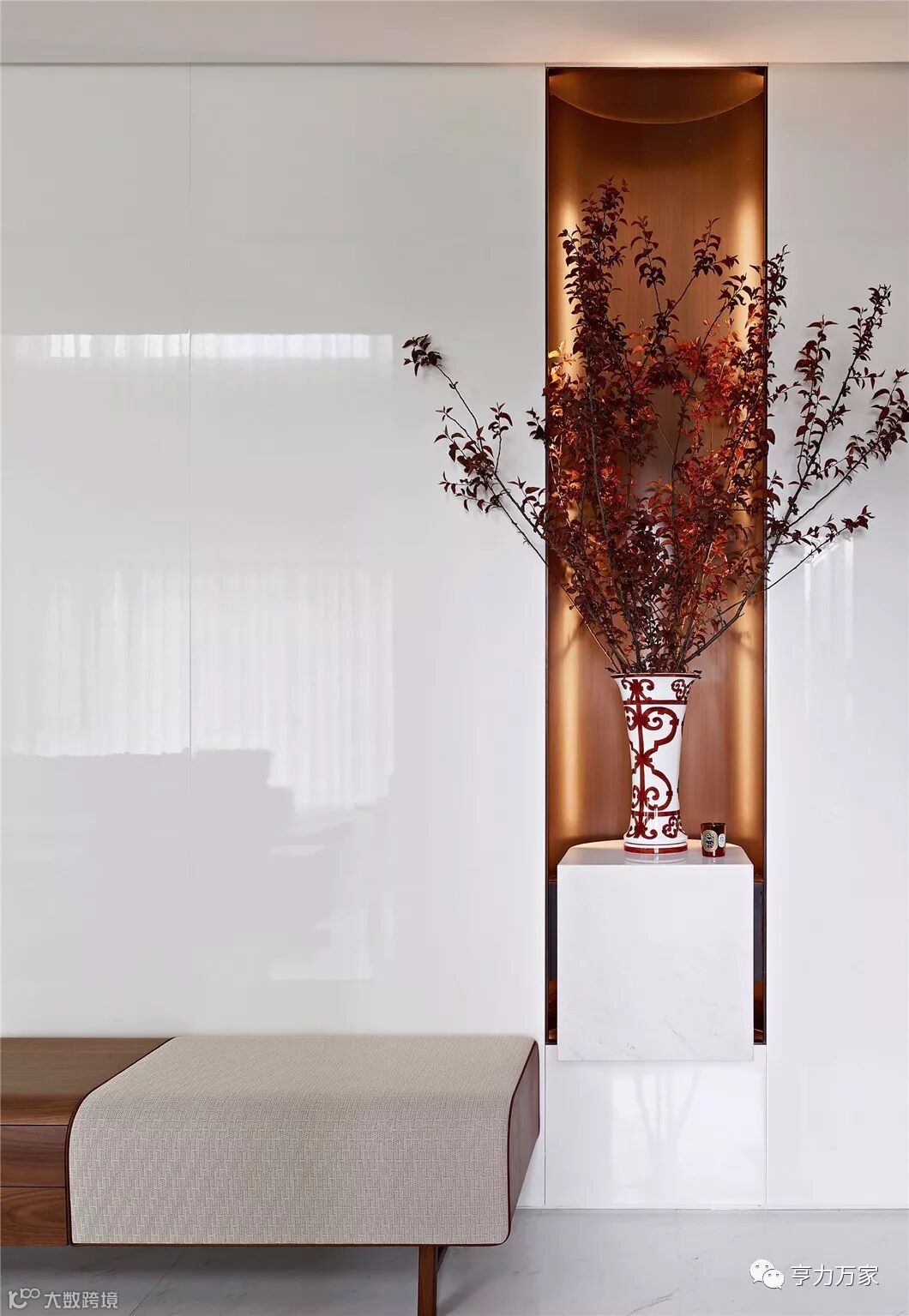 家是为我们遮蔽风雨,从喧嚣都市划出的领域,艺术的生活由此展开。案例入户白墙徐徐展开,如国画立轴的展示区,插花从墙面壁龛蓬勃出来欢迎主人回家。