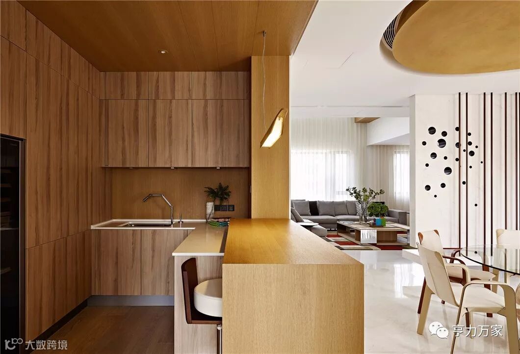方正的吧台与圆融的餐厅形成对应,一正一圆增加了空间的对比和张力,材质与整个空间的木作一致,保持质感的单纯。