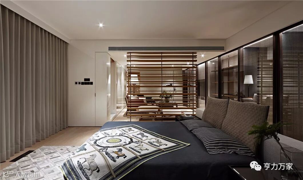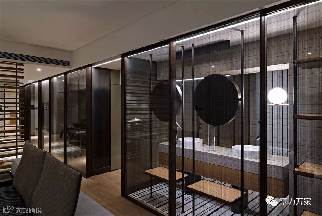 主浴与主卧间的通透,整面金属玻璃夹纱的柜体与屏风,与主卧起居室间串联起来,形成开敞中有细节的套房。到顶收藏展示架可以容纳满满的鞋子和包,都展现着主人的优雅品味 。