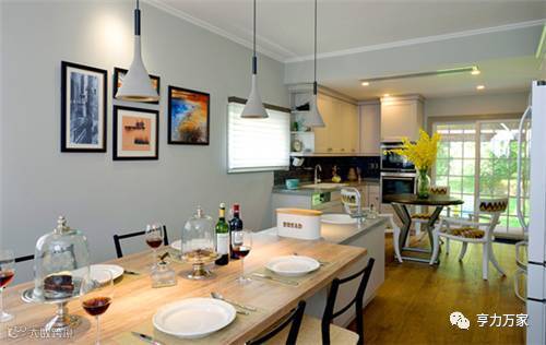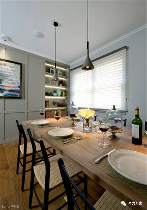 轻工业风的餐厅吊灯与墙面自然风景为主题的装饰画,增添了用餐区的现代时尚感。