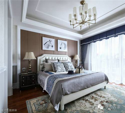 卧室整体具有华美浑厚的效果,特别是对称的布局和华美的装饰,色彩沉稳华丽,构成室内庄重豪华的气氛。