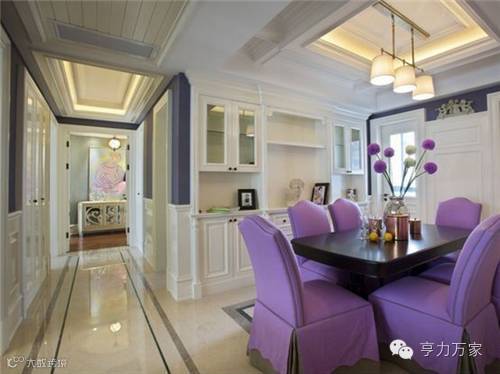 去掉堆砌的颜色和摆设,去掉繁复设计的多余家具,只用少许的蒲公英配饰物作为点缀和紫色的餐椅相互烘托,散发着女性的浪漫温柔,典雅高贵,使整个空间看起来简而不凡。